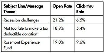 A series of emails were also sent which highlighted the benefit of making a tax deductible donation before the end of the year. Three versions of this email with different subject lines and copy points were sent at random to the prospects. The response rates were tracking to determine which segments responded to which copy points, and this information was used throughout the remainder of the campaign to drive participation rates. The message themes and responses to the three versions were as follows: