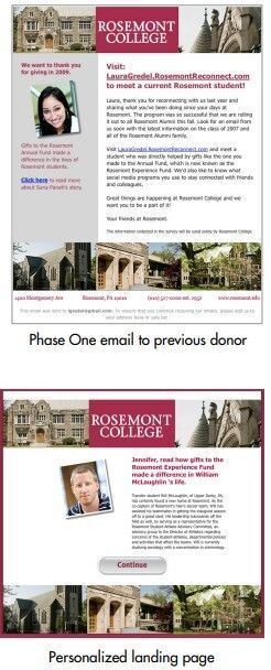 - Build a relationship before asking for money. The first phase of this campaign was focused on connecting with alumni and showing them how students with interests similar to their own benefitted from the Rosemont Experience Fund. Only after establishing this connection did the College ask for donations.