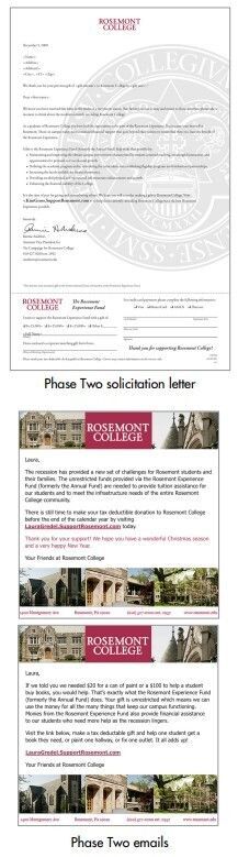 In December, a second round of communications was sent to all alumni and parents, except for those who had donated in Phase One. The purpose of this phase was to introduce the comprehensive campaign as well as draw support for the Rosemont Experience Fund.